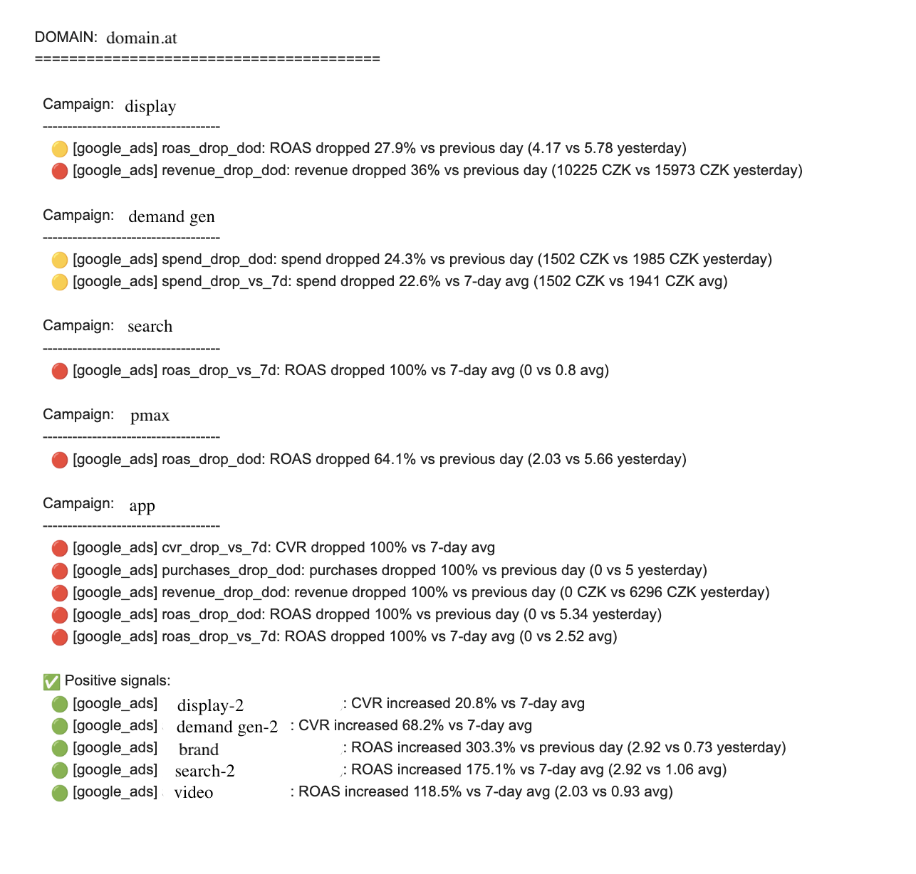 💡Nezapomeňte na efektivní nastavení thresholdu – nechcete aby vám vyskočila změna u kampaně, která přinesla dvě konverze oproti čtyřem z předchozího dne. Takové kampaně tu vždy budou, ale není nutné, aby nám kvůli nim chodil ať už pozitivní, tak negativní alerting.