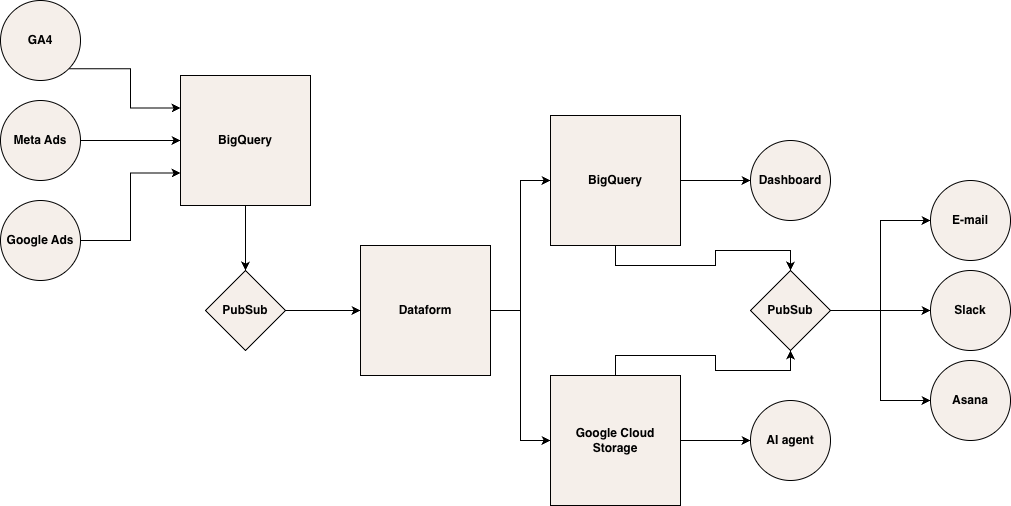 Na vstupu potřebujeme samozřejmě data. V tomto případě budeme pracovat s daty z GA4, Google Ads a Meta Ads, která se nám skrze konektory nahrávají do BigQuery. Jakmile máme data kompletní (např. za předchozí den), Pub/Sub spustí Dataform (případně dbt), kde probíhá veškerá modelovací magie.