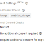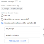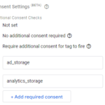 Consent u tagu funguje jako druhá vrstva triggeru – nespustí se, když k tomu nemá povolení. Těchto podmínek ke spouštění nechceme dávat příliš mnoho, protože pak by se mohlo stát, že se nám nespustí nikdy. Je například zbytečné dávat jako podmínku spuštění ad_storage (reklamní cookies), když od uživatelů nesbíráme žádná data spojená s reklamou, nebo naopak přidávat analytics_storage, když je nástroj pouze reklamní a nemá analytické možnosti.