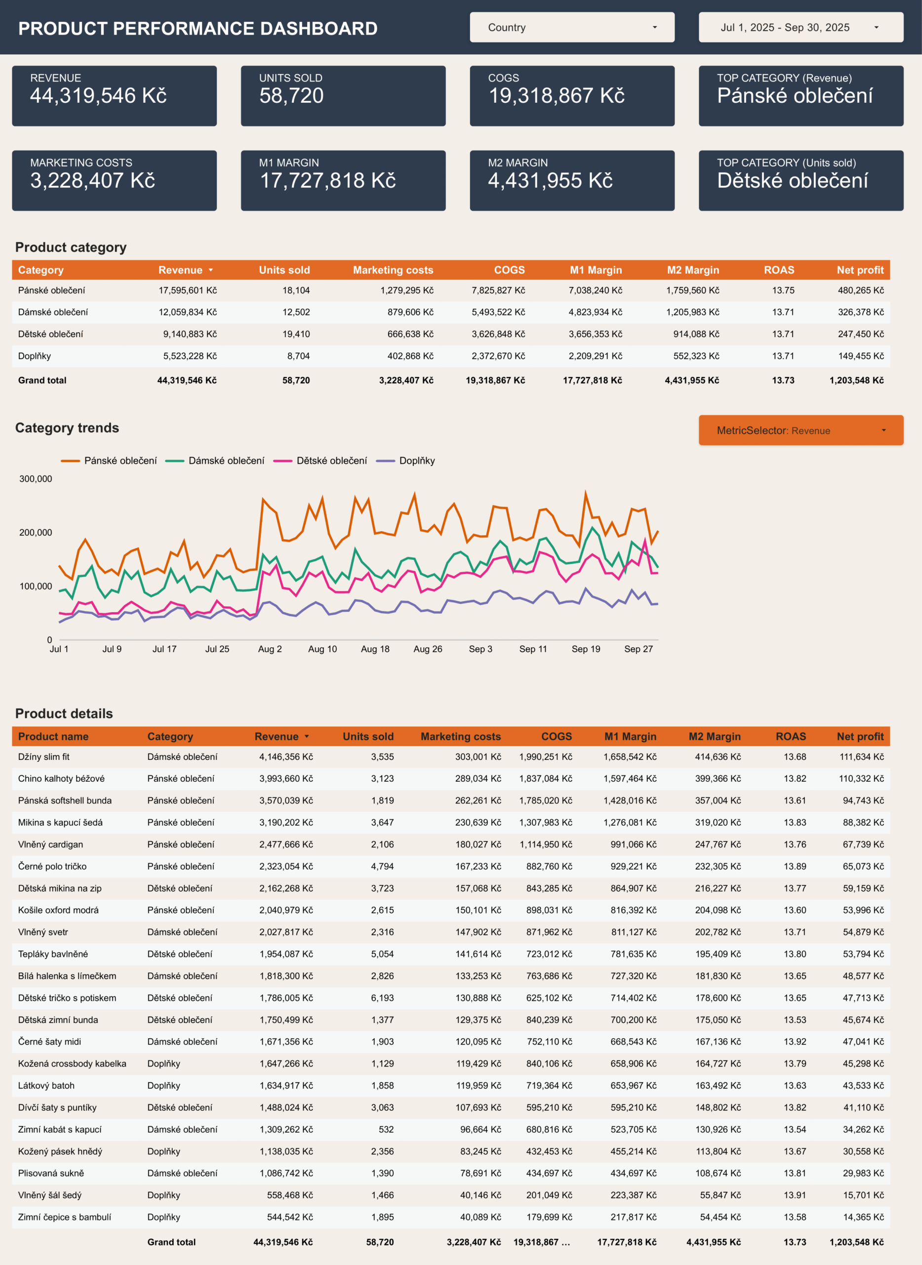 Produktový report pro vedení pracuje především s rozpadem dle kategorie doplněným o detail na úrovni produktu.