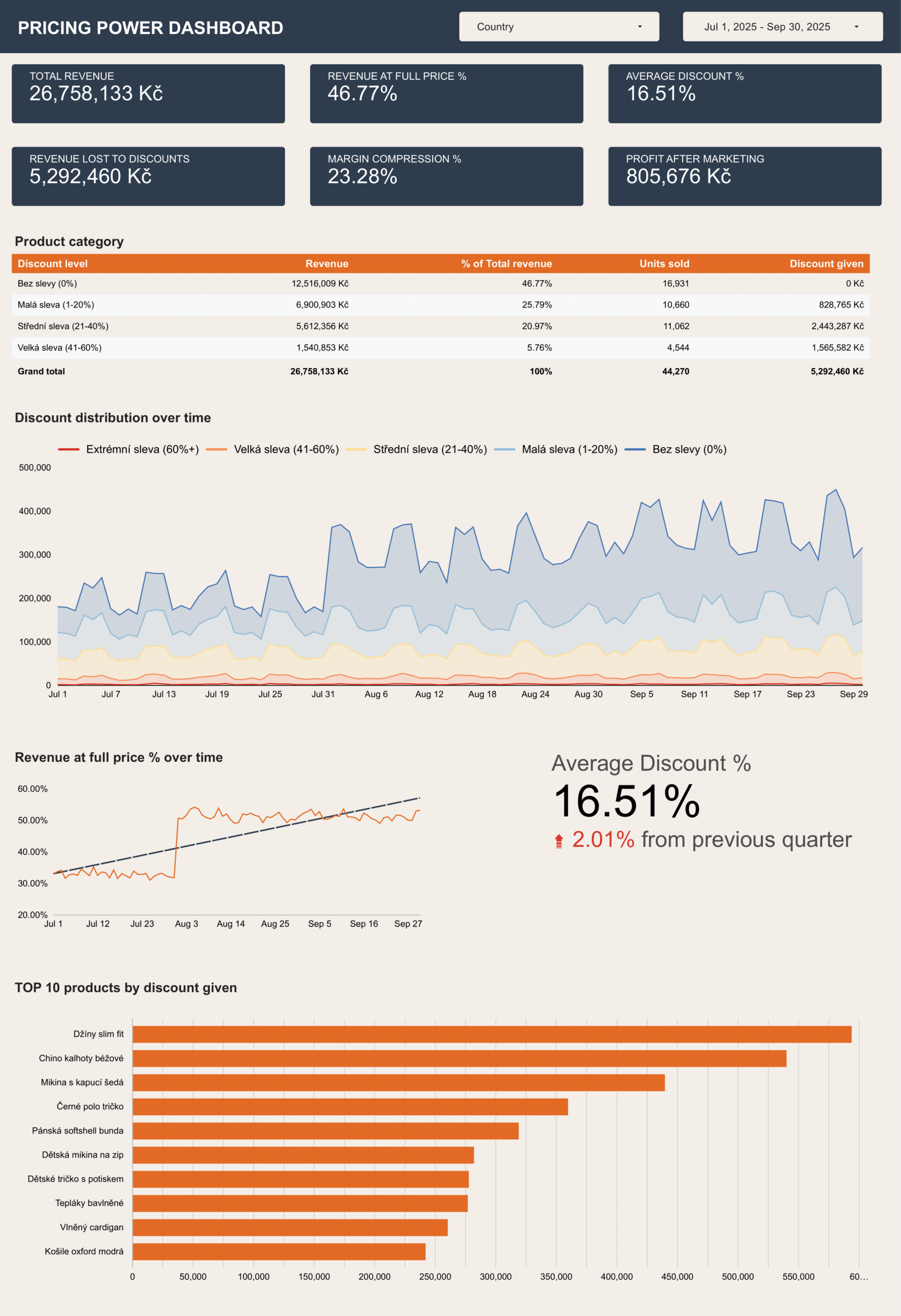 Málokterý report dokáže na první dobrou tak hezky ukázat, jak moc je firma závislá na slevách a jak se slevová senzitivita zákazníků v průběhu času mění. Hlavní rozdělení ukazuje, jak velká část produktů se prodala s jakou výší slevy, jak moc jsou zákazníci ochotni nakupovat za plnou cenu a jak vypadá průměrná výše slevy.