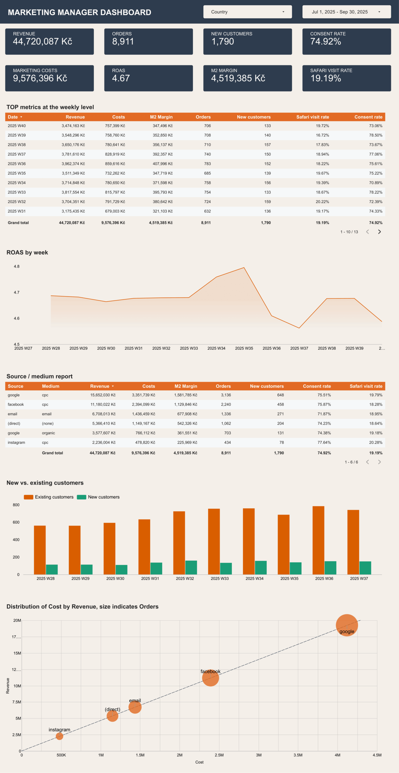 Základní přehled pro marketingového manažera oproti tomu většinou nevyžaduje dvě úrovně marže a obejde se i bez AOV a CLV nových zákazníků. Ve většině případů se mu bude pracovat lépe s týdenní granularitou místo denní. Zásadní je poté rozpad výsledků dle kanálu. Ať už doplněný o pohled alternativního atribučního modelu, nebo jako v tomto případě, srovnávající naměřené výsledky s consent rate dle zdroje a % návštěvnosti daného kanálu ze Safari. Tak, aby marketingový manažer na první pohled viděl, jak moc je daný zdroj asi nad/podhodnocený oproti celku.