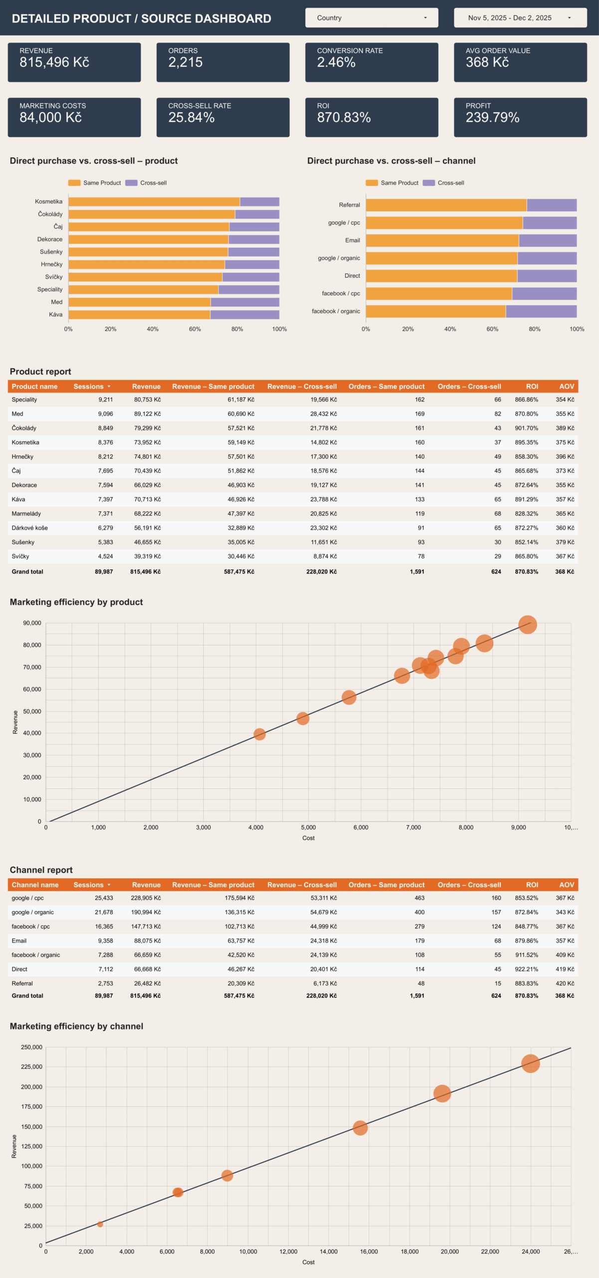 Užitečné je pro mě na první pohled jasné srovnání same-product cross-sell jak na úrovni kategorie, tak na úrovni kanálu. To je případně další možná úprava reportu - srovnání prodeje produktu / kategorie dle kanálu. Tento pohled pomáhá odhalit případné mezery v propagaci na úrovni produktové nabídky, které můžeme využít.