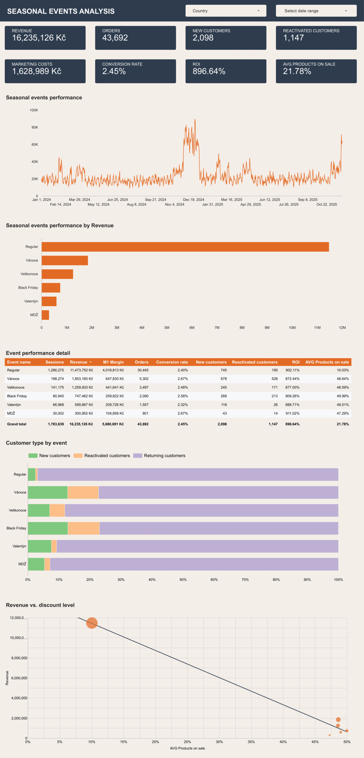 Report slevových akcí nám odpovídá na to, jak velkou část našich prodejů mají na svědomí akce a jak se dařilo poslední akci v kontextu ostatních. Pro big picture přehled může být dostatečný, já bych jej ve většině případů doplnil o informaci, jak dlouho akce běžela. I pokud si myslíte, že akce budete navždy dělat pouze týdenní, doporučuji délku akce do reportu vždycky přidat.