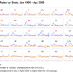 Pokud existují formy, kde se datově‑vizualizační minimalismus projevuje nejvíce, jsou to small multiples a sparklines. Oba vizualizační objekty jsou minimalistické již ze své podstaty a pro chartjunk tak není téměř žádný prostor.