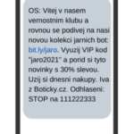 Prioritou pro ÚOOÚ v roce 2023 je kontrola SMS rozesílek. Pro ty platí velmi podobná pravidla jako pro e‑mailing. Více jsme o nich psali v článku Jak využít SMS kampaně a nespálit se? Každý jeden kontakt musí udělit souhlas. SMS zároveň musí obsahovat možnost odhlášení z odběru. Myslete i na to, že ne každý má chytrý telefon, proto pro odhlášení z databáze neposílejte URL adresy. Správně to může vypadat např. takto: